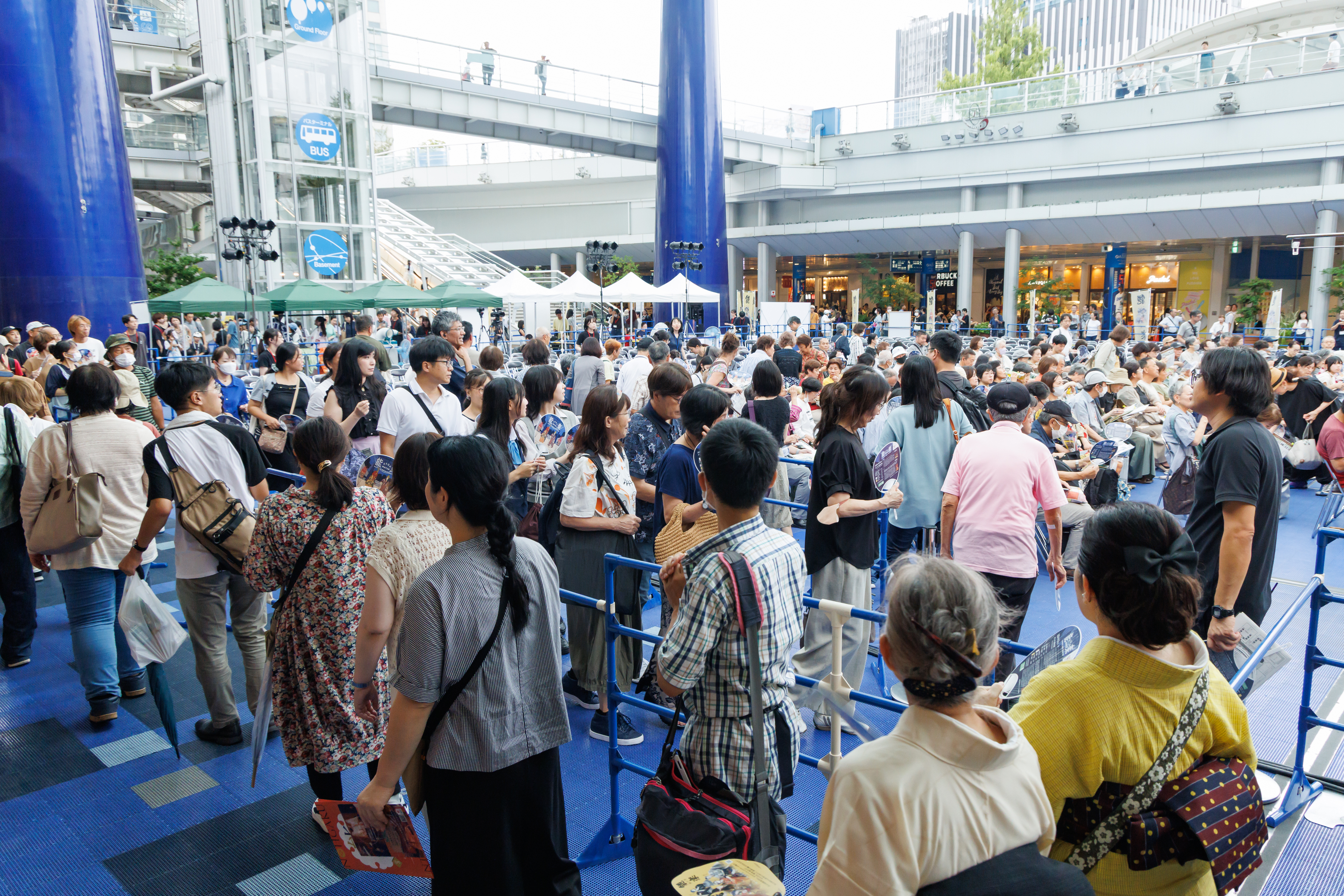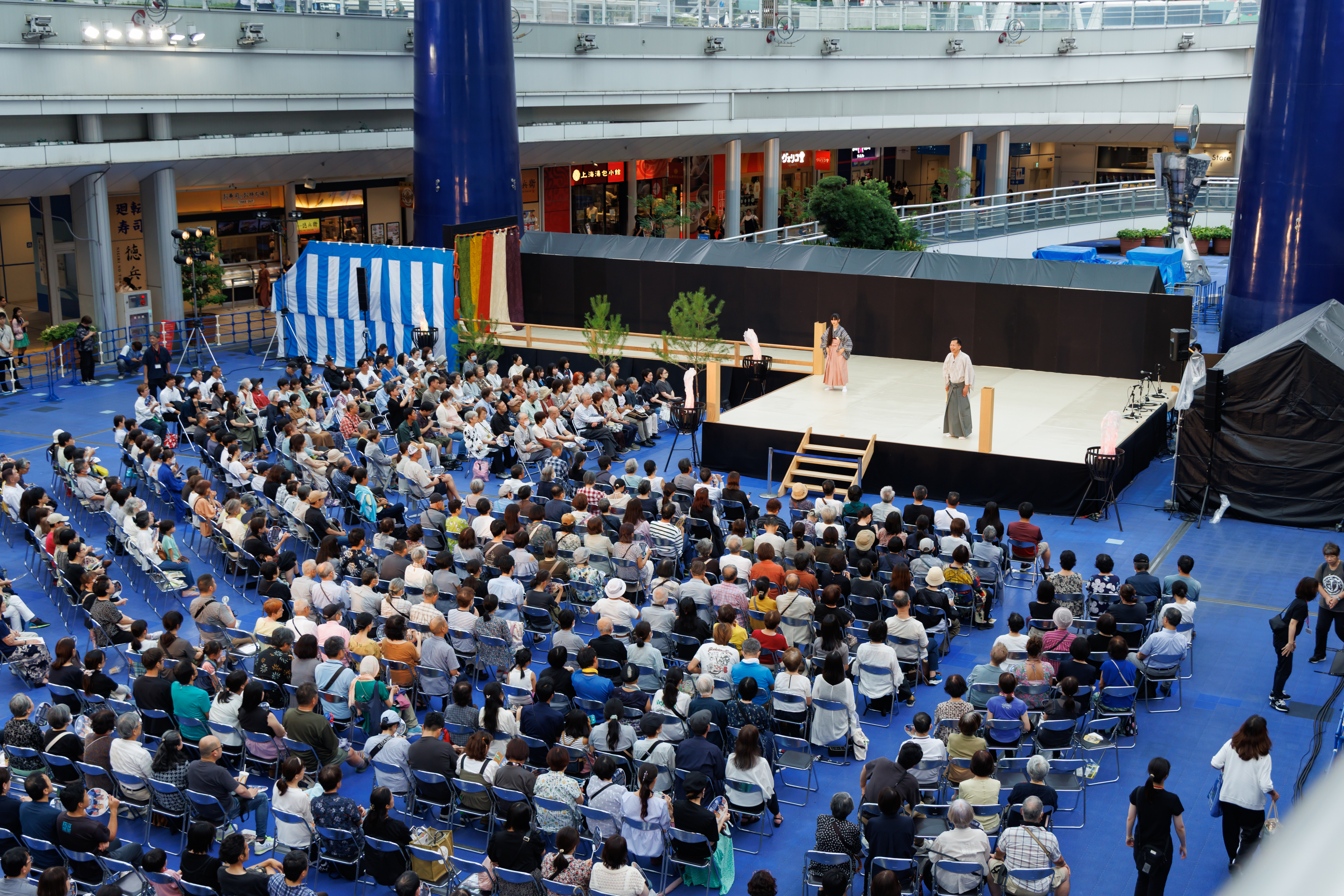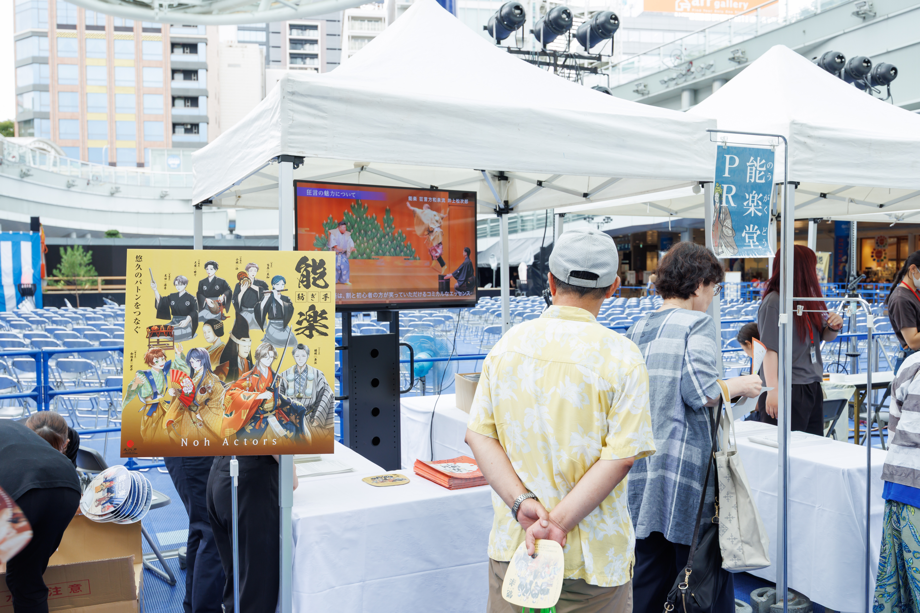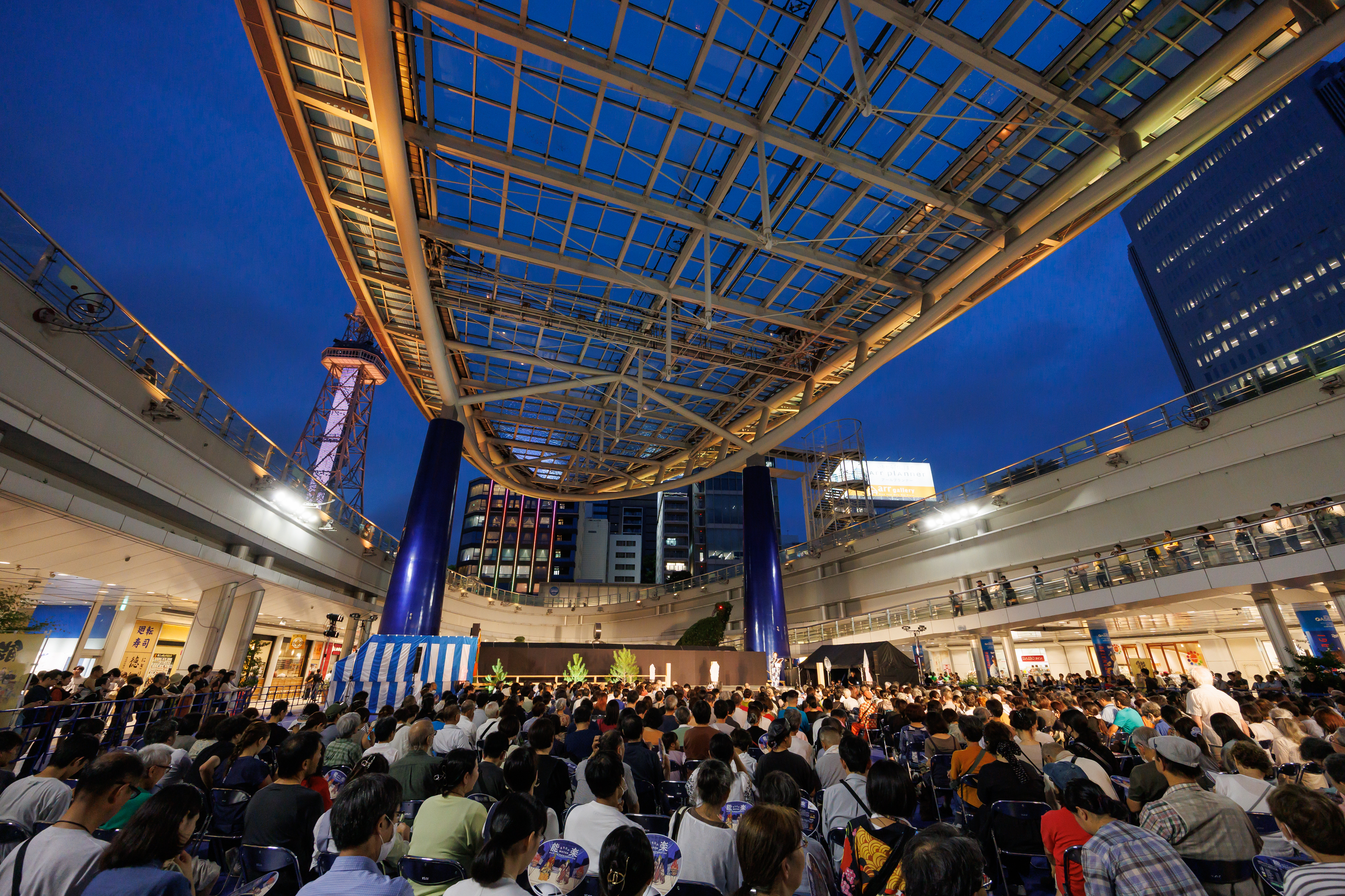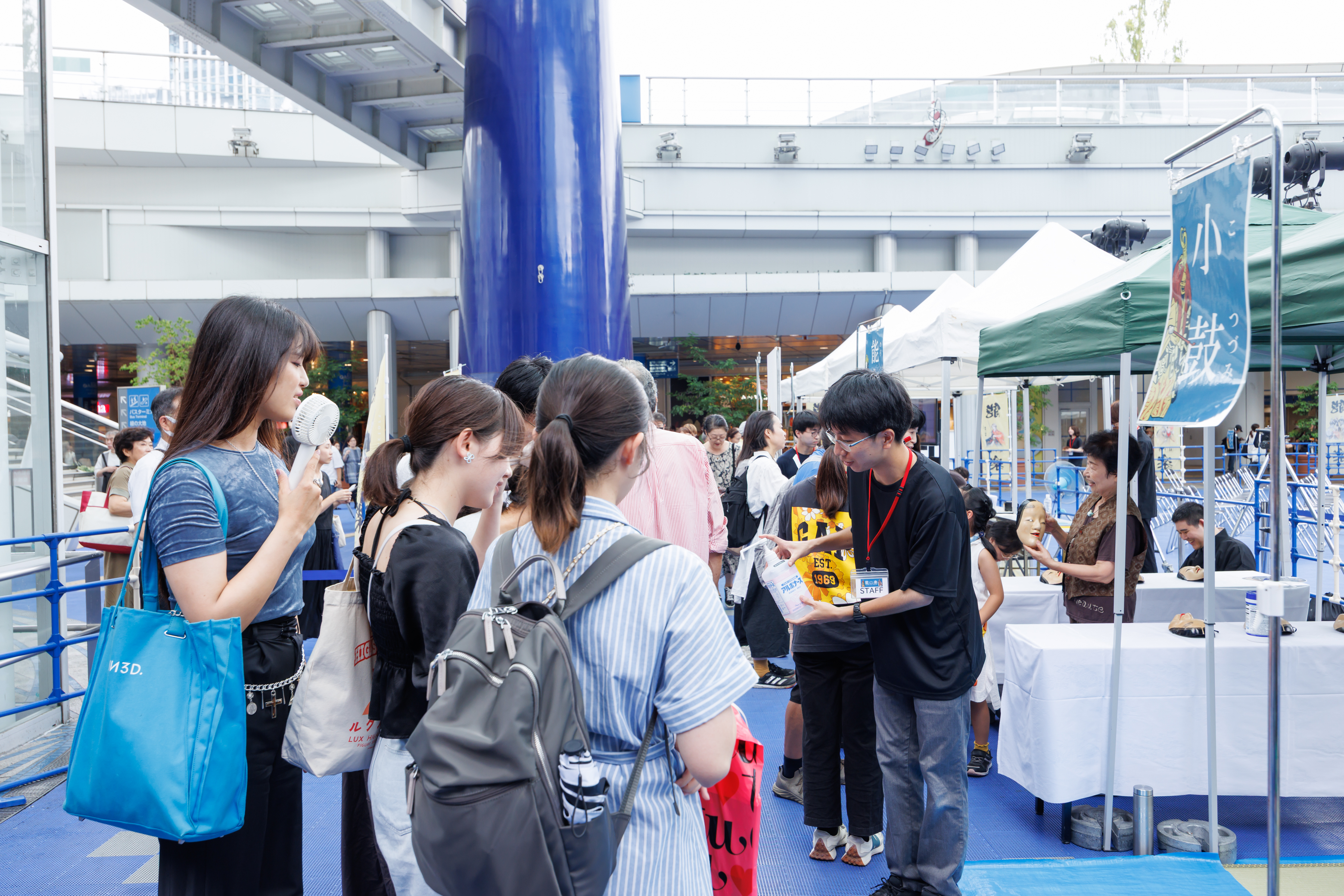 名古屋能楽堂をPRするために、まずは能楽を気軽に楽しんでもらおう! ということで、名古屋の中心地・栄のオアシス21で能楽公演を開催しました。本公演の前には、能楽を学ぶ若い世代の皆さんによる発表ステージも実施。また、能楽体験コーナーでは、能面をつけたり、太鼓を打ったりと、いずれも無料ということで、世界に誇る伝統芸能・能楽の幽玄の世界を一日中、多くの皆様にご堪能いただきました。
