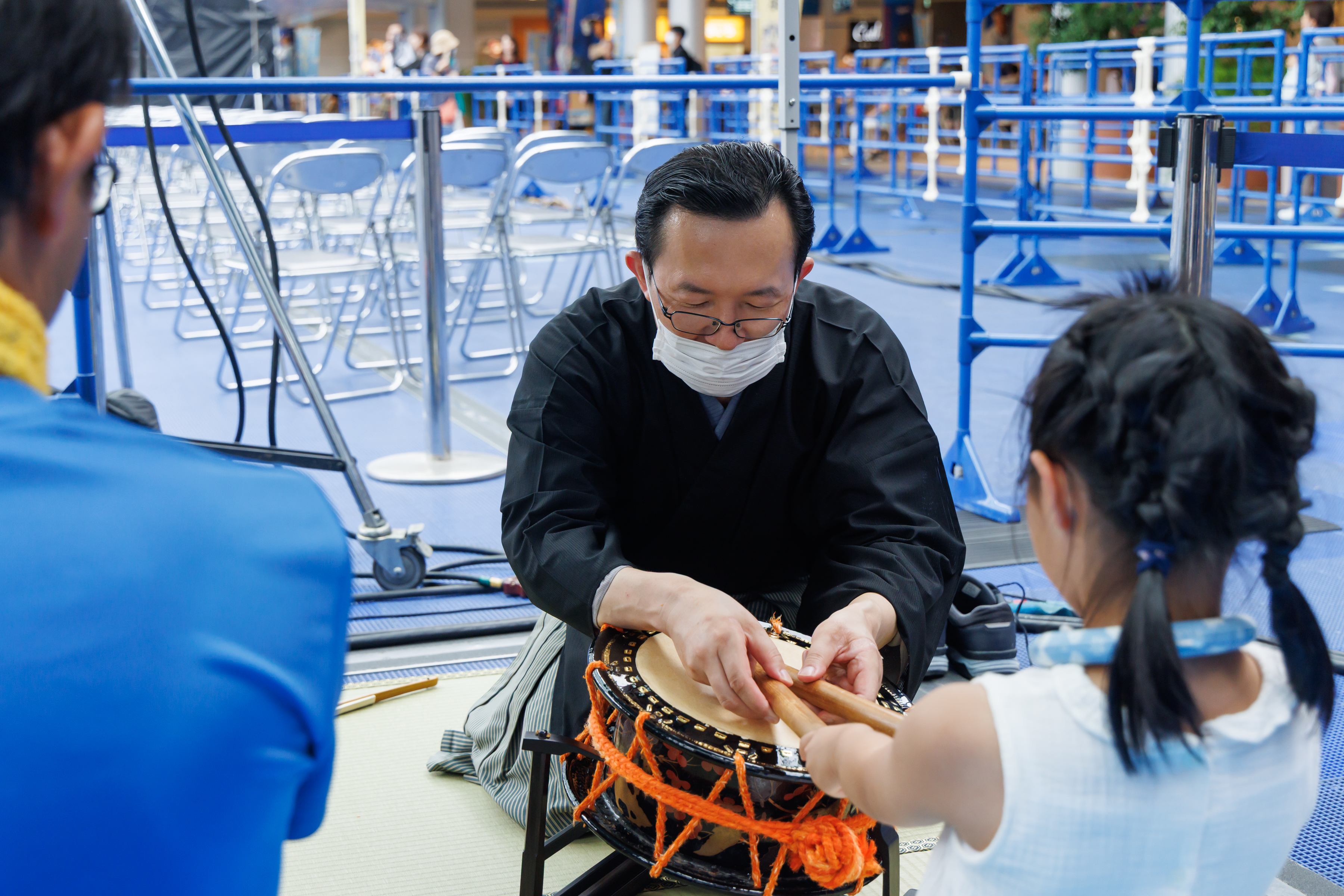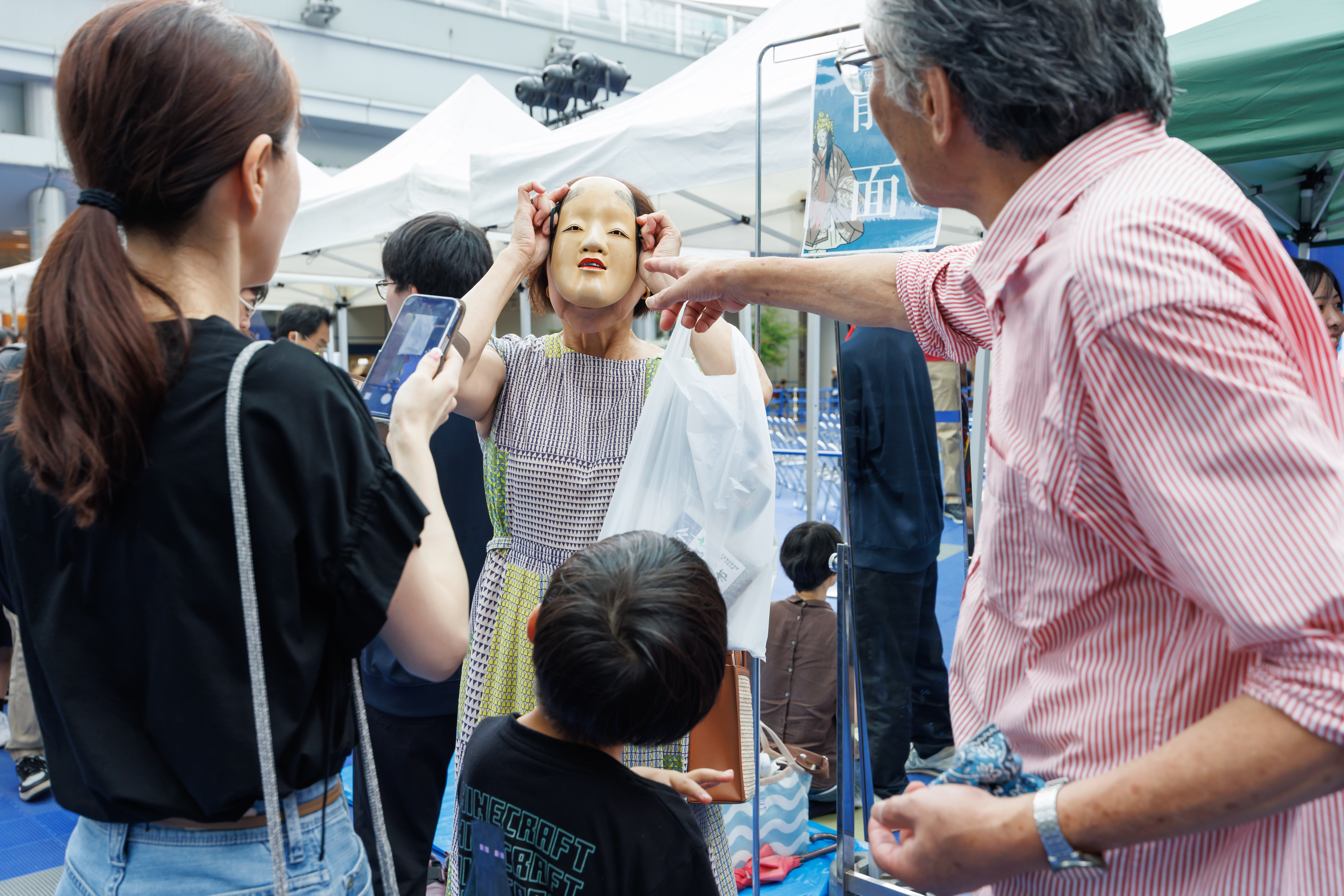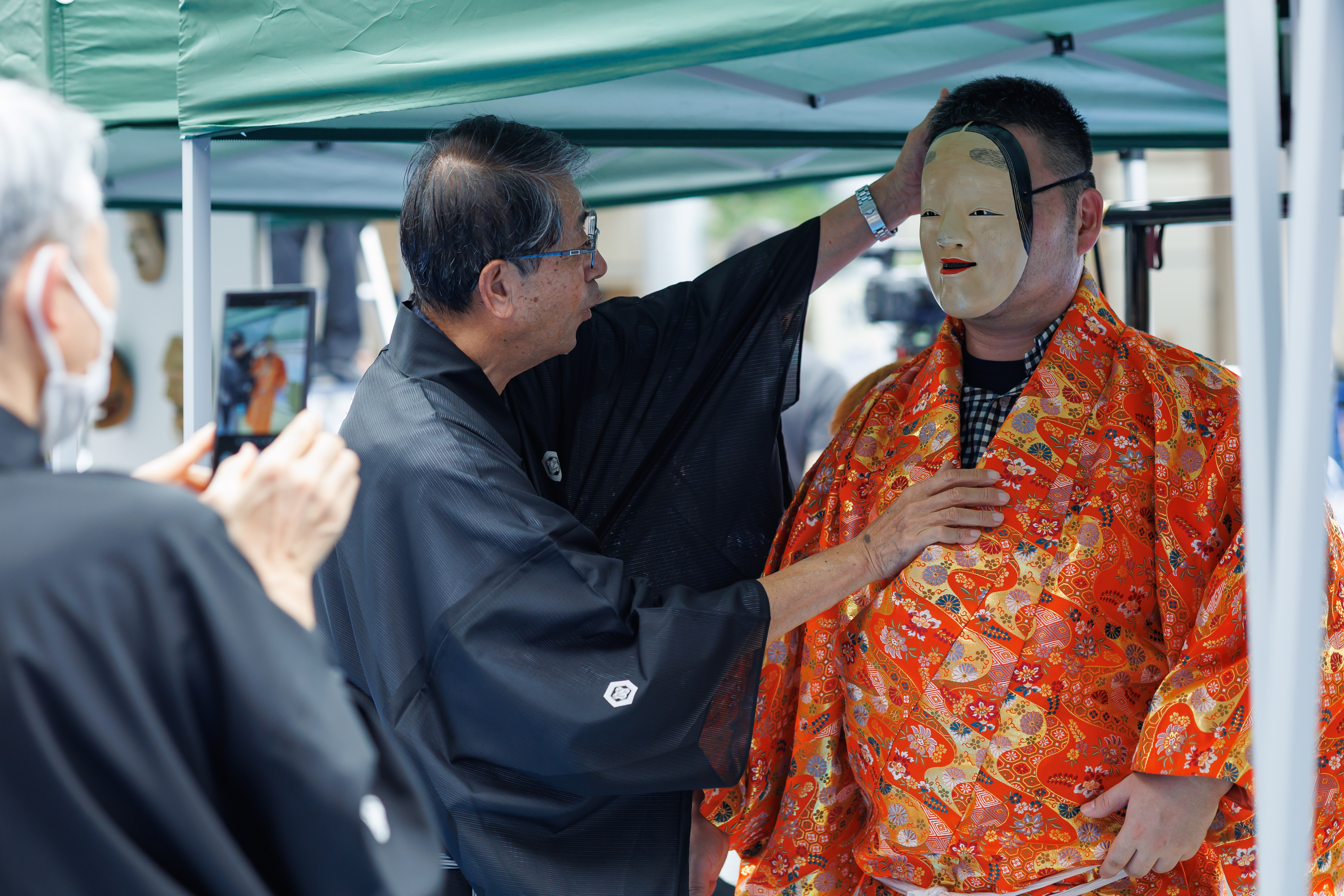 見るだけでなく、実際に能楽に触れ、体験してもらおうと、装束・能面の試着や小鼓・大鼓・太鼓を体験していただく能楽体験コーナーを実施。プロの能楽師や能面作家に教えてもらいながら、たくさんの人が体験しました。