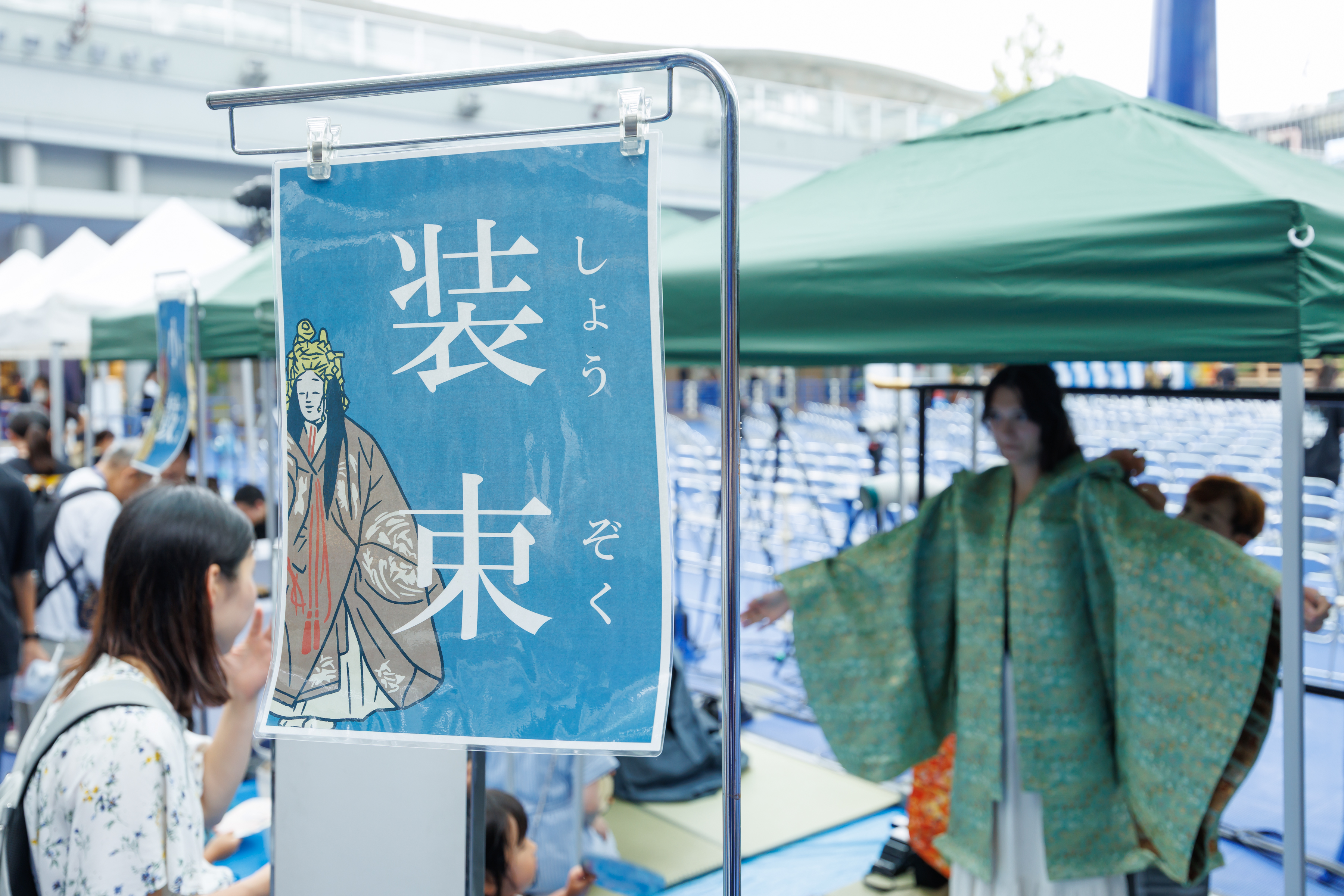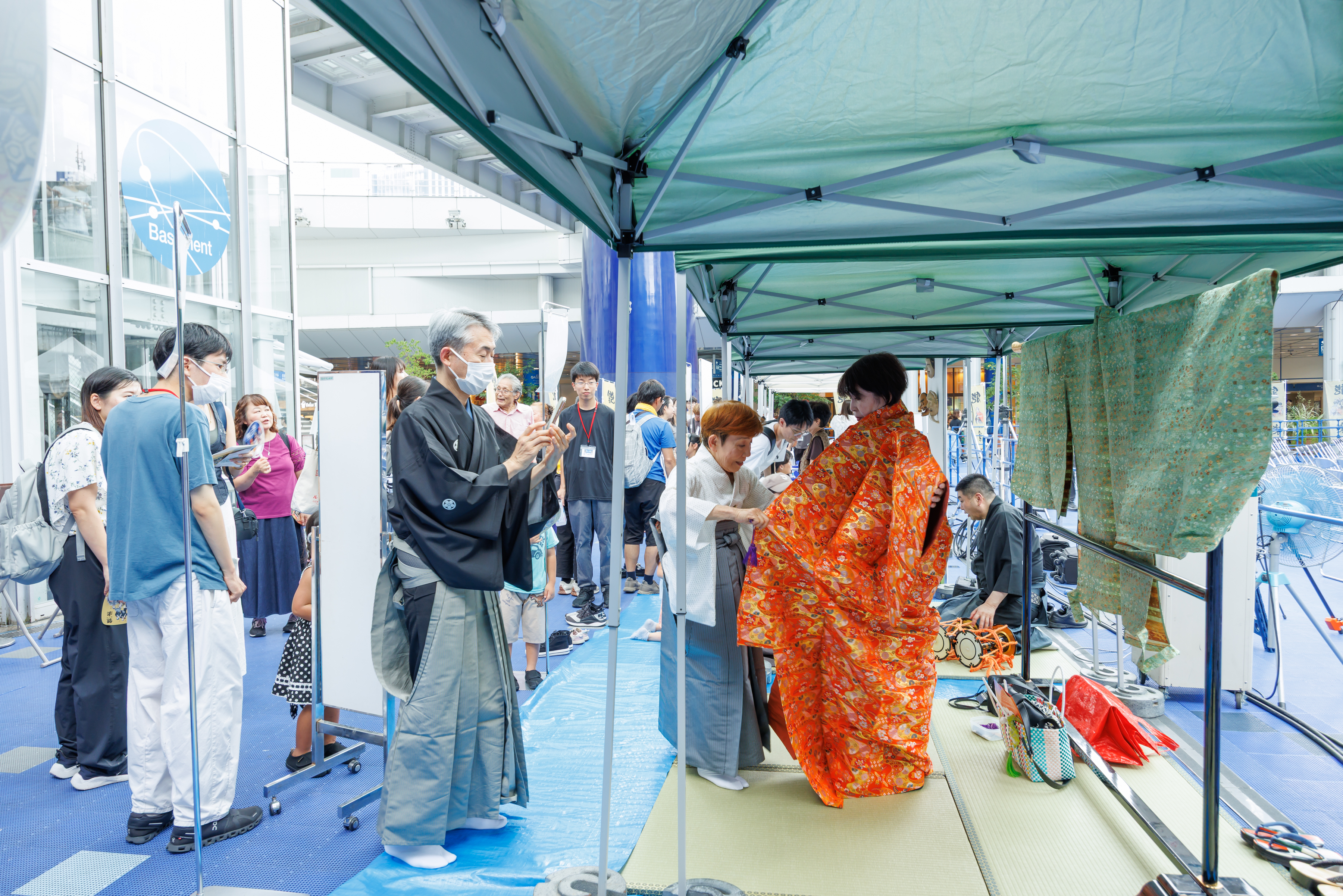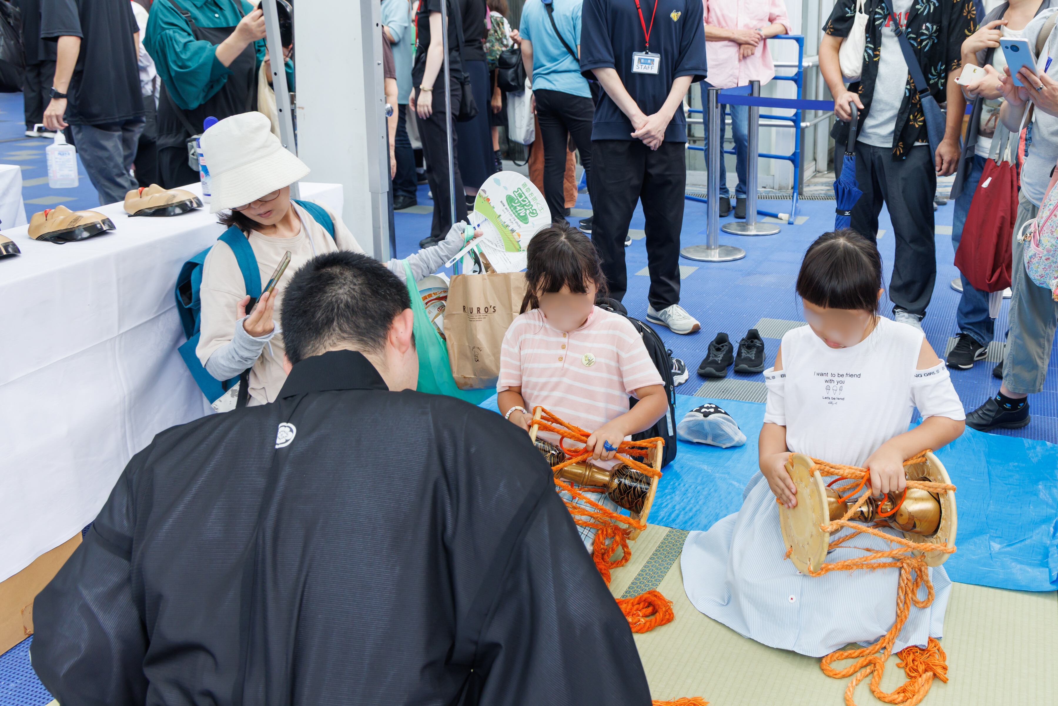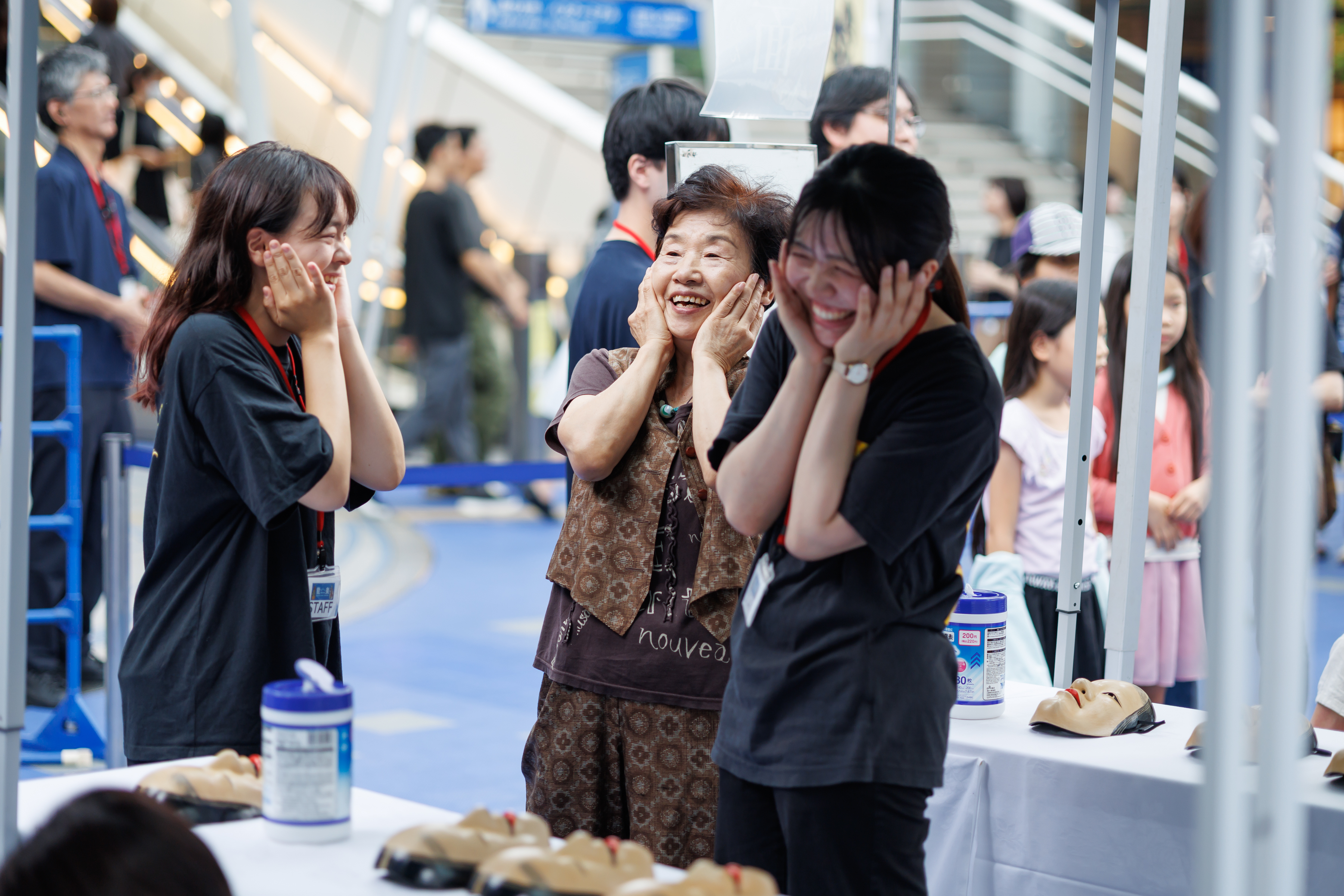 見るだけでなく、実際に能楽に触れ、体験してもらおうと、装束・能面の試着や小鼓・大鼓・太鼓を体験していただく能楽体験コーナーを実施。プロの能楽師や能面作家に教えてもらいながら、たくさんの人が体験しました。