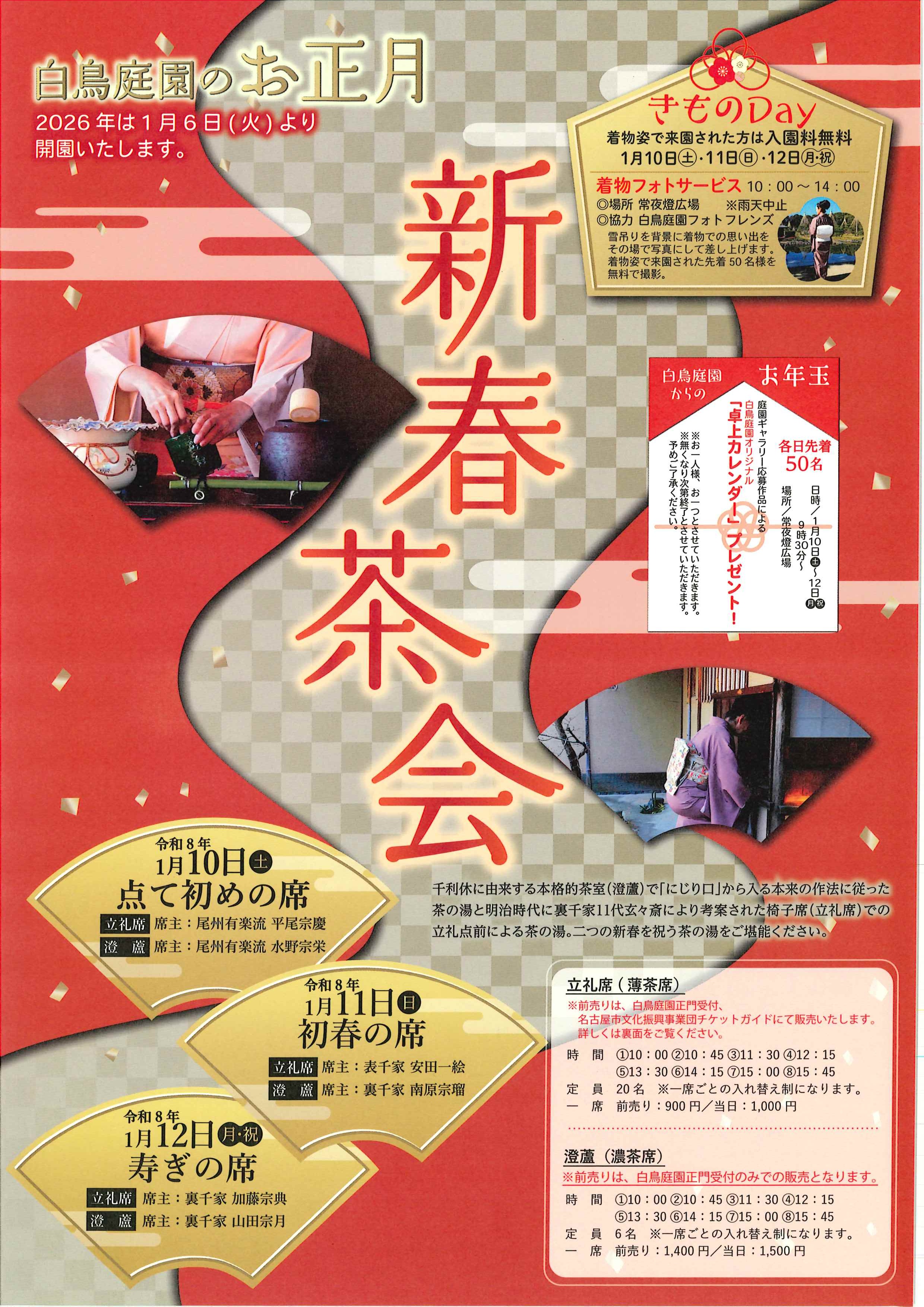 新春茶会 薄茶席 立礼席 900円 ※別途、入園料が必要です。 (ただし「白鳥庭園のお正月」期間中は着物姿の方は入園料無料) |