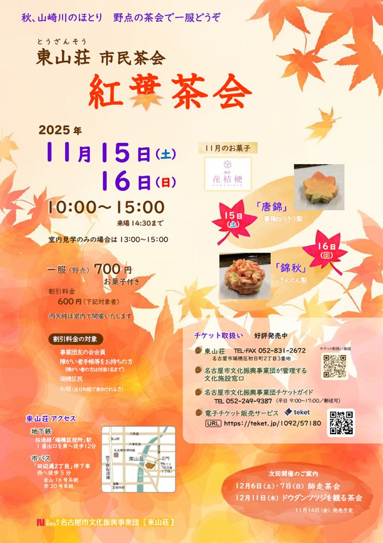 | チケット購入・申し込み | 9月25日(木) 9:00 チケット販売開始 チケット取扱い ・東山荘 TEL 052-831-2672 ・その他 名古屋市文化振興事業団が管理する文化施設の窓口 ・名古屋市文化振興事業団チケットガイド TEL 052-249-9387 ・電子チケット販売サービス teket(テケト) |