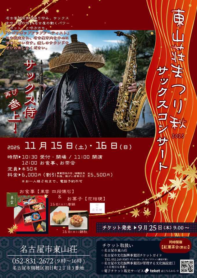 日付指定・全自由席(昼食・紅葉茶会での一服付き) 一般 6,000円 割引 5,500円 ・名古屋市文化振興事業団友の会会員 |