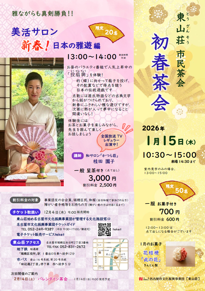 【茶会のみ 〈定員50名〉】 700円 割引料金 600円(下記対象者) 【美活サロン~新春! 日本の雅遊編~/呈茶(点て出し)付き〈定員 20名〉】 ※和服以外は、チケット購入時(teket購入者は来場時)に対象であることがわかるもの |