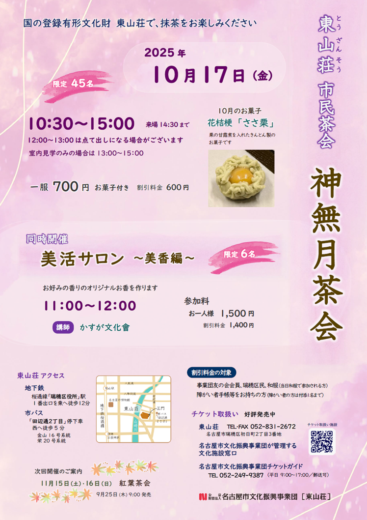 | チケット購入・申し込み | 【9月17日(水)9:00 販売開始】 チケット取扱い ・東山荘 ・名古屋市文化振興事業団チケットガイド TEL052-249-9387 ※チケット事前購入制です  |
