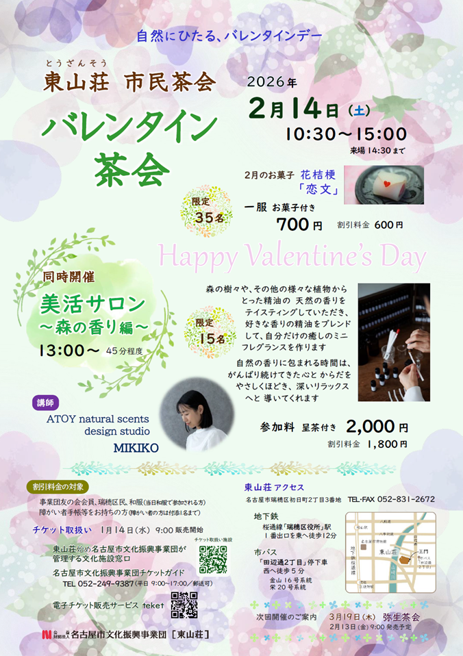 | チケット購入・申し込み | 【1月14日(水)9:00 販売開始予定】 チケット取扱い ・東山荘 ・名古屋市文化振興事業団チケットガイド TEL052-249-9387 ※チケット事前購入制です |
