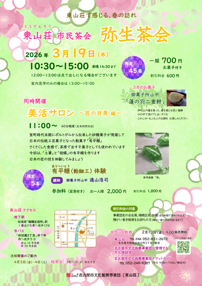 | チケット購入・申し込み | 【2月13日(金)9:00 販売開始】 チケット取扱い ・東山荘 ・名古屋市文化振興事業団チケットガイド TEL052-249-9387 ※チケット事前購入制です |