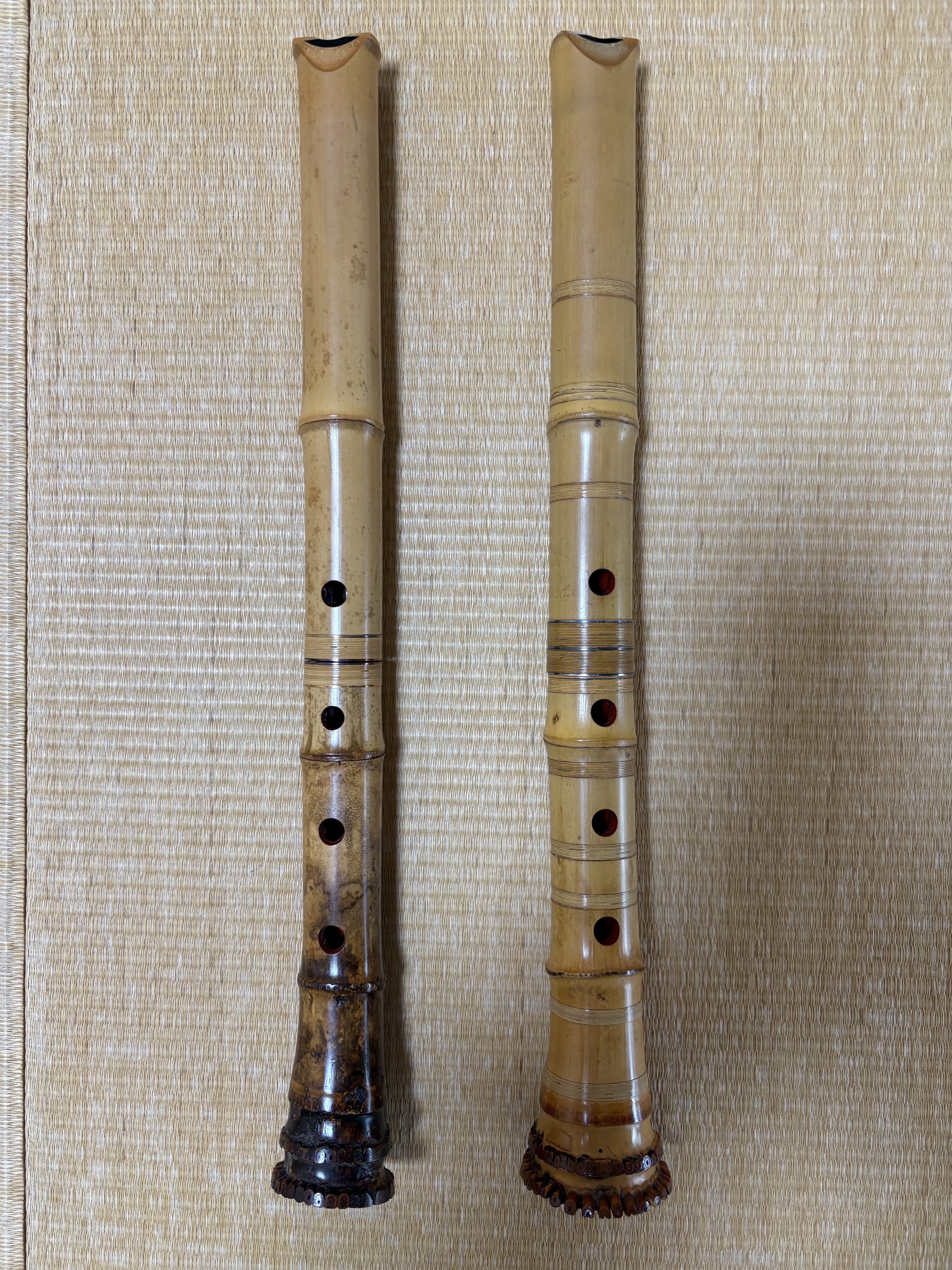 急な温度湿度変化に、竹で出来ている尺八が耐えきれず、縦にパックリ割れてしまう事があります。勿論、修理代金もかかりますし、修理後は写真のように、ぐるぐるといっぱい鉢巻をすることになります(右が修理した尺八)。