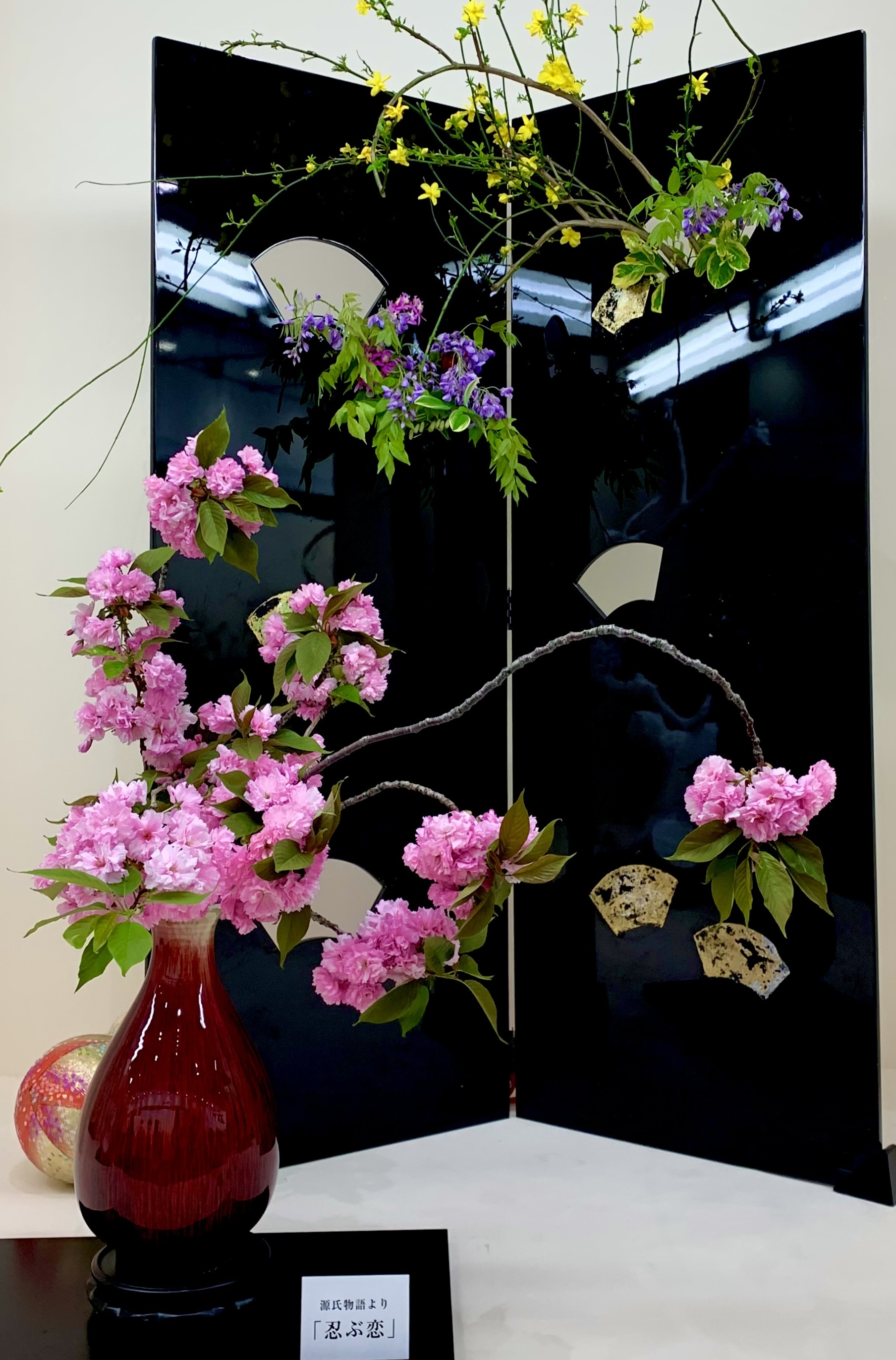 今回の作品は、大阪の高島屋で開催された日本いけばな芸術展に出品したものです。縦横およそ160センチの三人席という広い空間で、恩師である深川美翠先生、平田明翠先生と共にいけた、思い出深い作品となりました。テーマは『源氏物語』より「忍ぶ恋」。幼い若紫が春の花の下で無邪気に手鞠遊びをする様子を、物陰から静かに見守る光源氏の姿を重ね、控えめながらも深い想いを表現しています。花材には、牡丹桜、レンギョウ、藤、シャガを用いました。